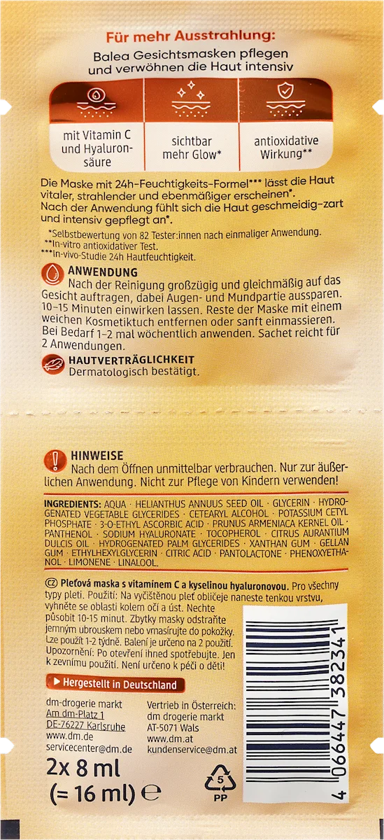 اختبري عناية متكاملة مع Balea Vitamin C Maske – تركيبة مبتكرة تمنحك بشرة مشرقة، ناعمة ومليئة بالحيوية بفضل الترطيب العميق والتأثير المضاد للأكسدة.