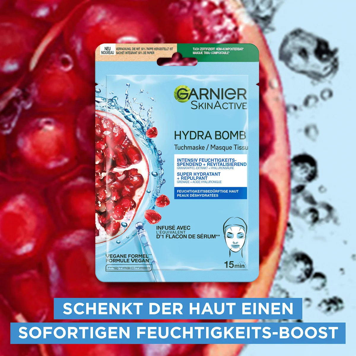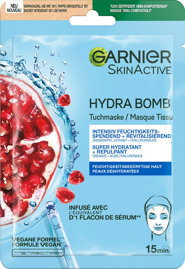 دلّلي بشرتك بقوة مضادات الأكسدة مع قناع Garnier Hydra Bomb بالرمان.