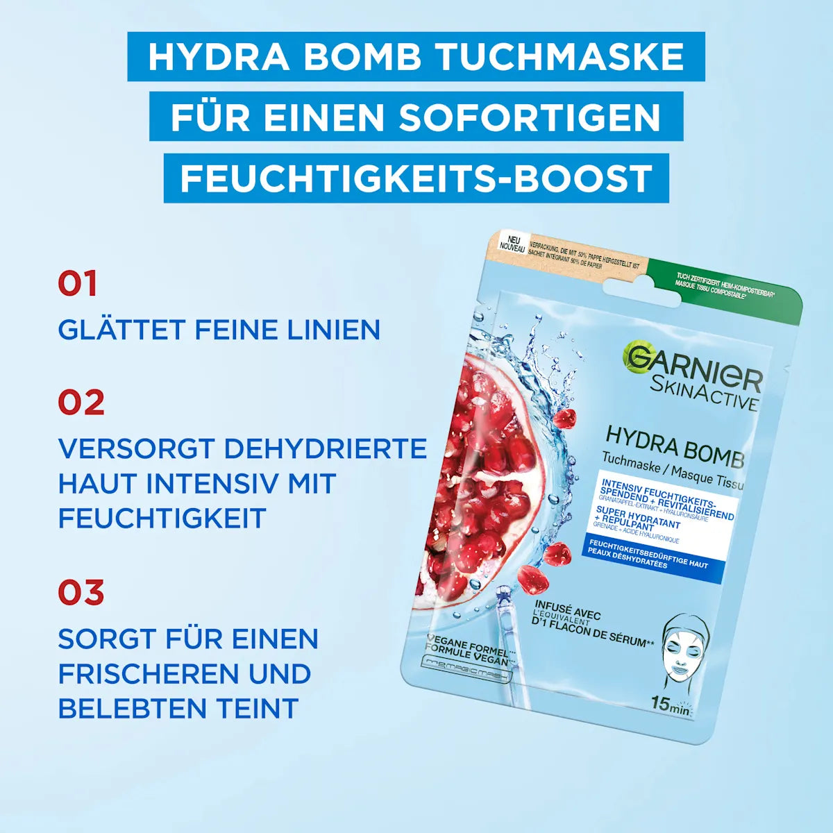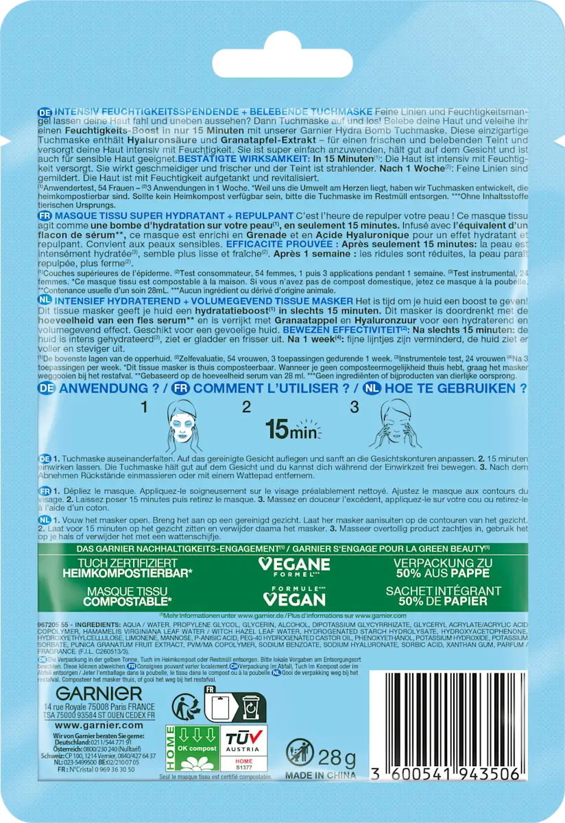 قناع غارنييه هيدرا بوم بالرمان – ترطيب عميق وتأثير مشدّد للبشرة | 28 جم